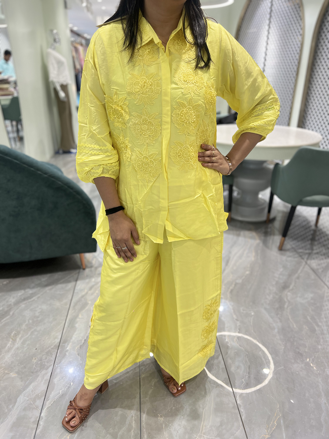 This yellow chinone cordset is crafted with fine embroidery detailing. It is designed to bring...
