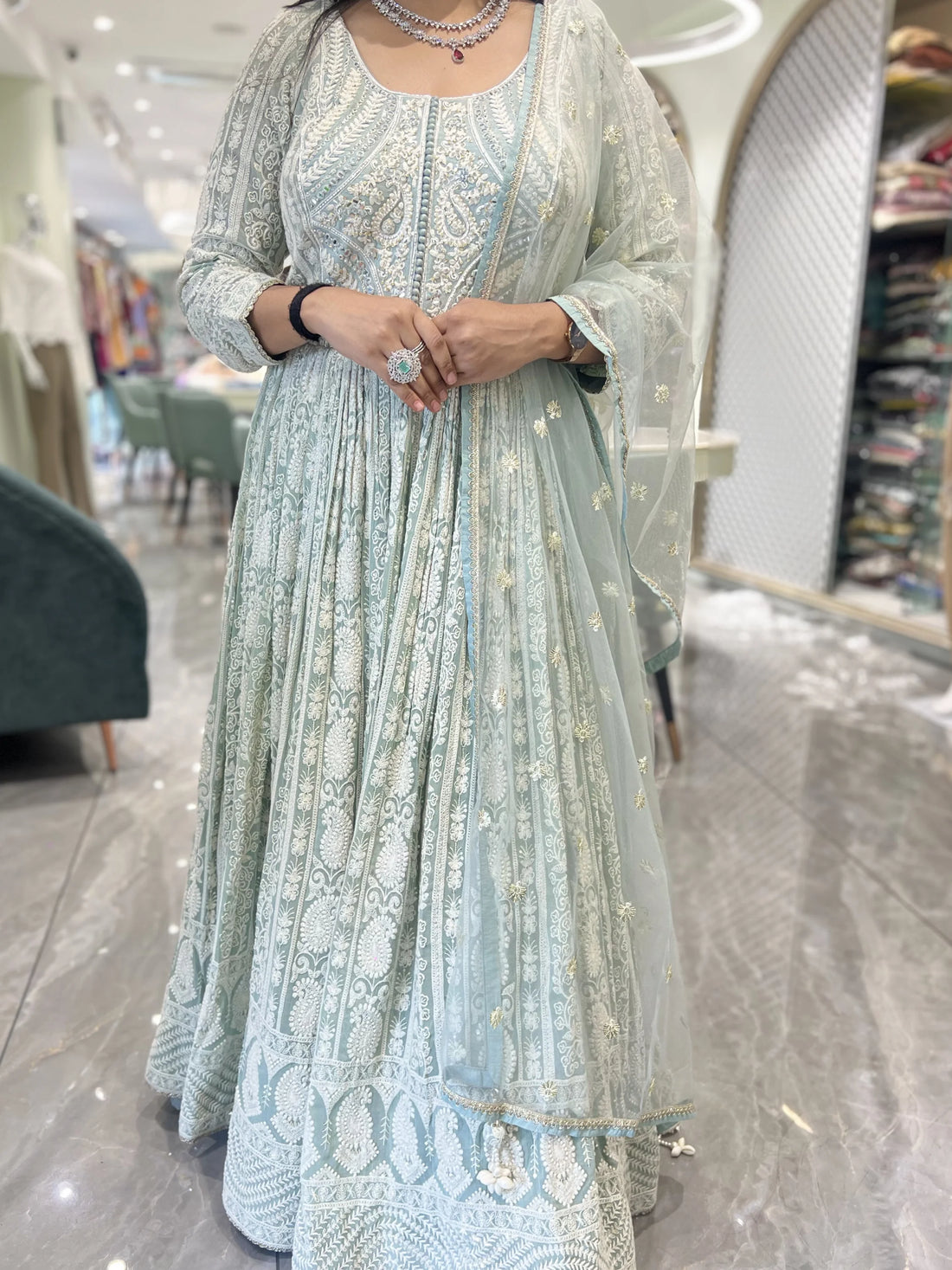 Seafoam Green Mirror Work Georgette Gown - ADGORI MIX-1