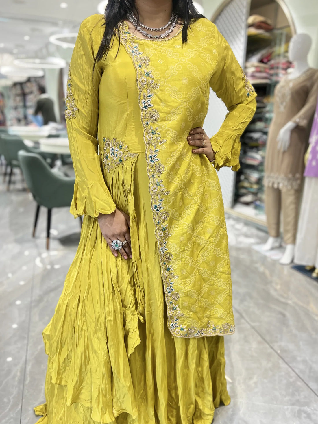 This mustard yellow modal silk gown is crafted with fine hand work detailing. It is...