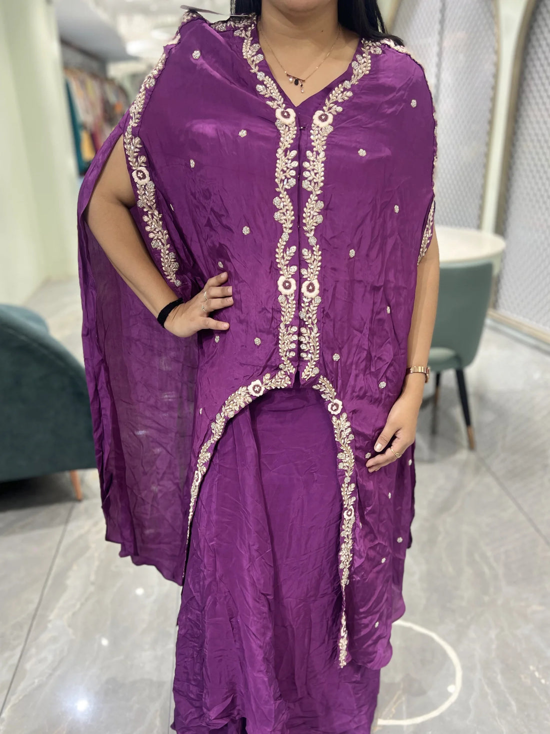 This purple chinone indo western is crafted with fine embroidery detailing. It is designed to...