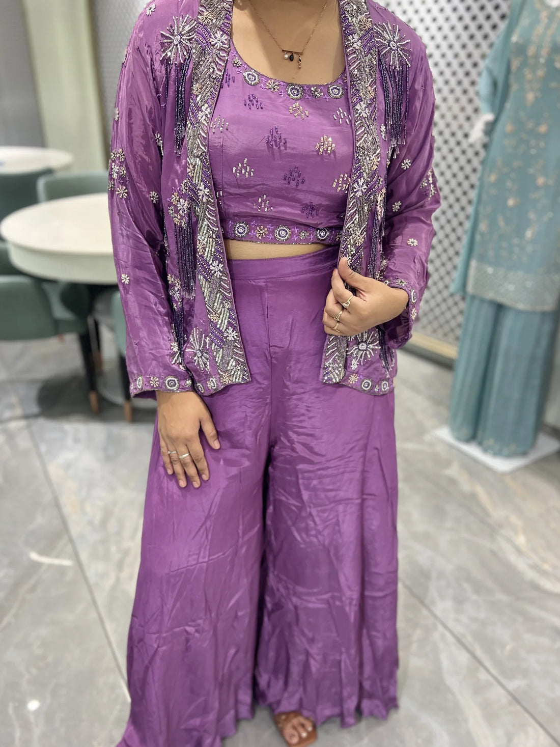 This lavender chinon indo western is crafted with fine embroidery detailing. It is designed to...