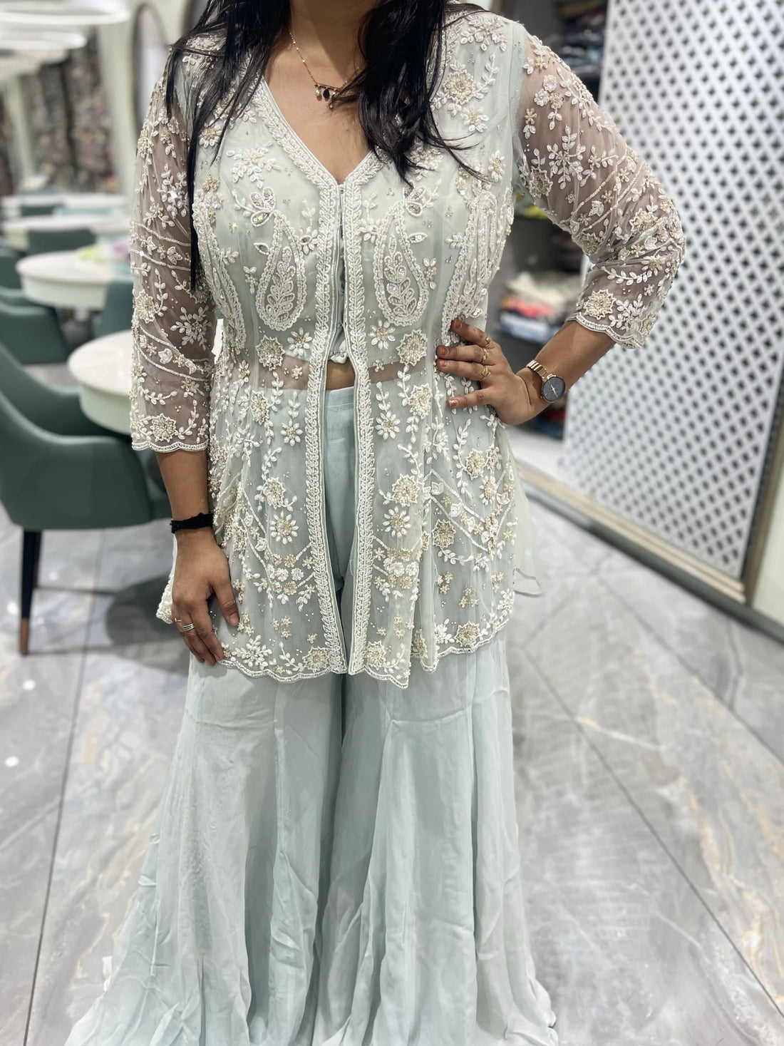Pale Green Hand Work Roman Silk Indo Western - VFGORI 7452 2