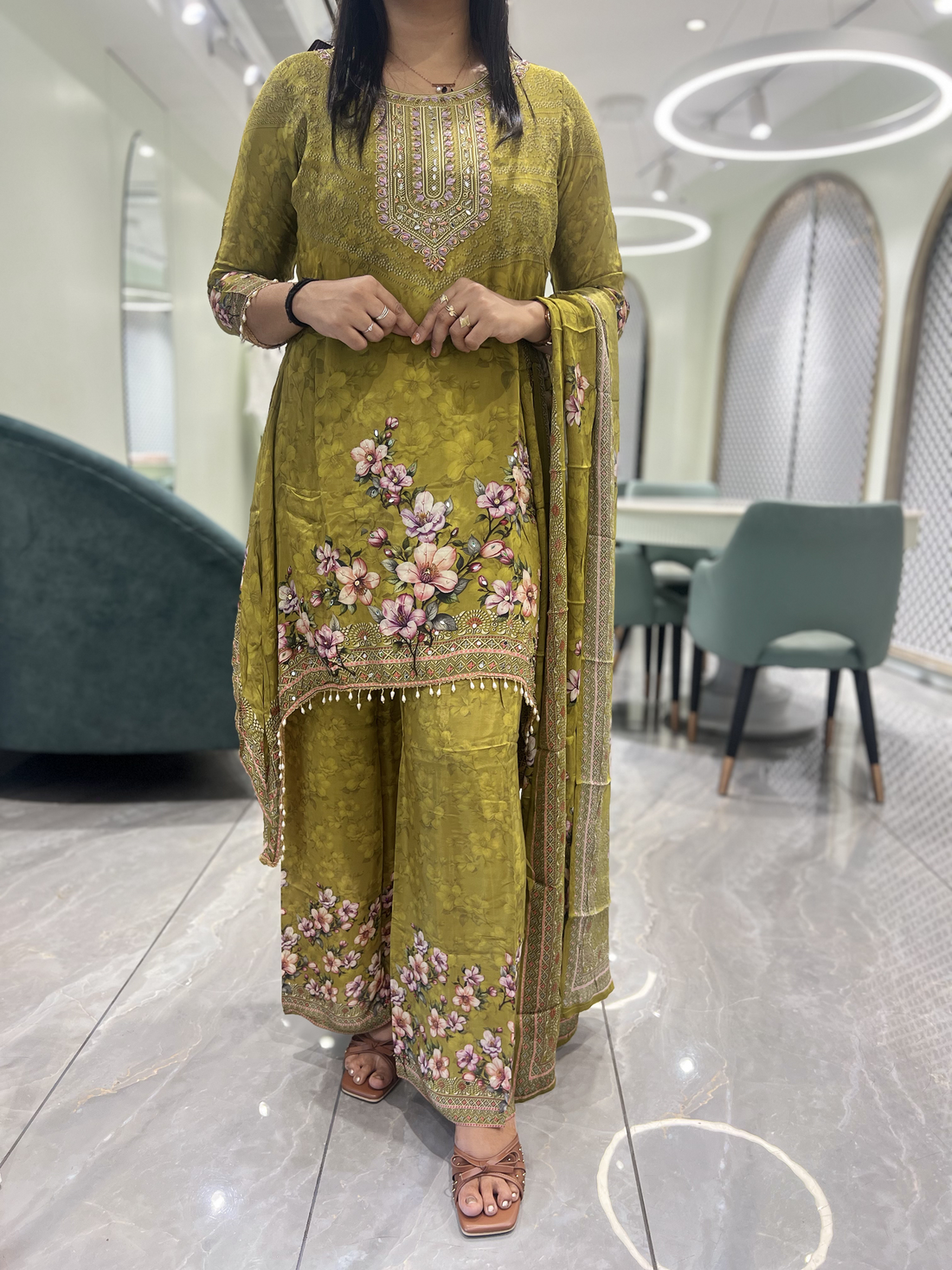 This mint green chinon three-piece is crafted with fine embroidery detailing. It is designed to...