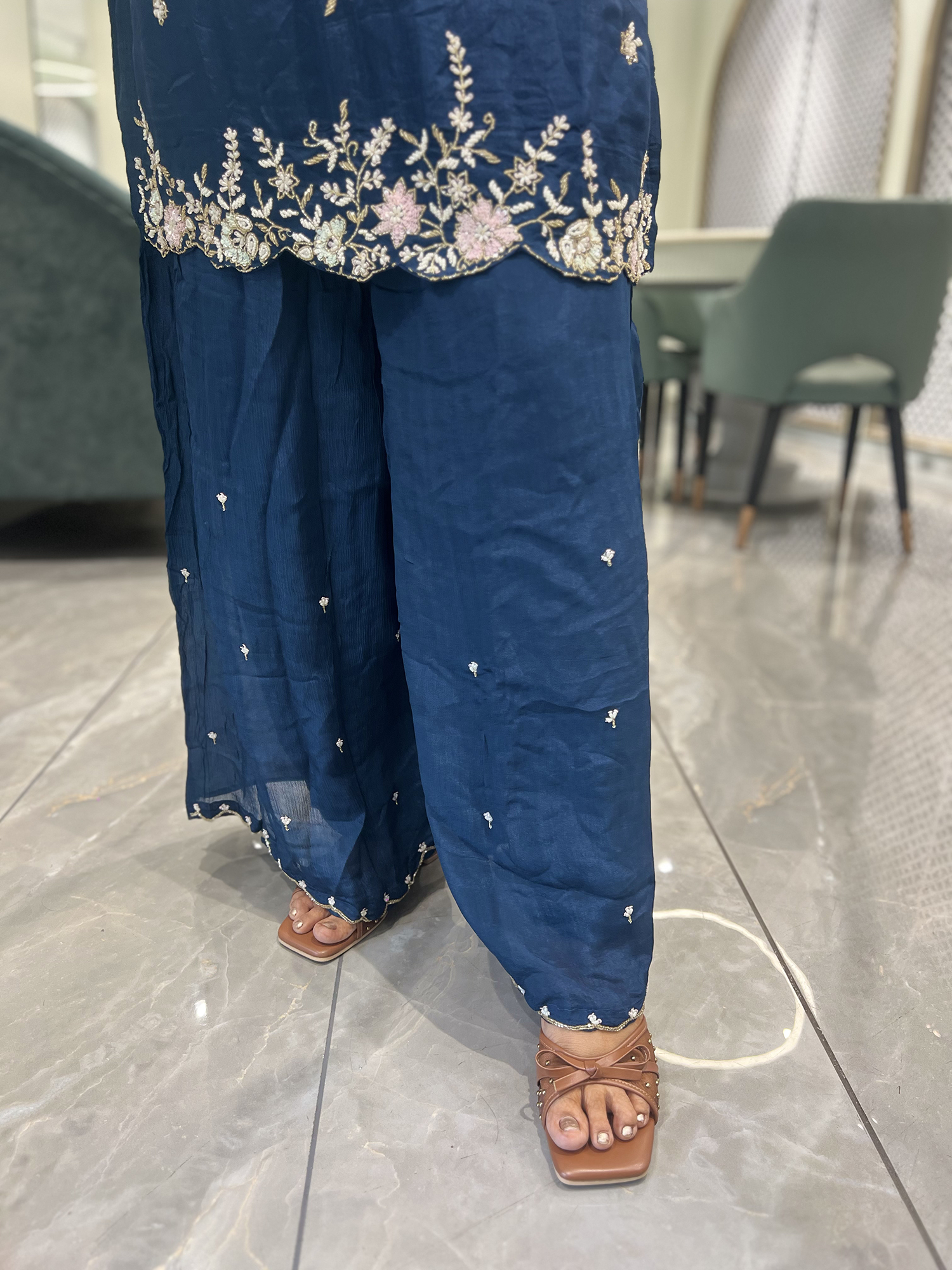 This blue chinon three-piece is crafted with fine hand work detailing. It is designed to bring out elegance and grace, making it perfect for weddings, receptions, parties, and festive occasions. Made with high-quality chinon fabric, this attire ensures comfort while maintaining a premium look. The intricate hand work work enhances its appeal, giving it a sophisticated finish. Ideal for those who appreciate traditional craftsmanship with a modern touch.
