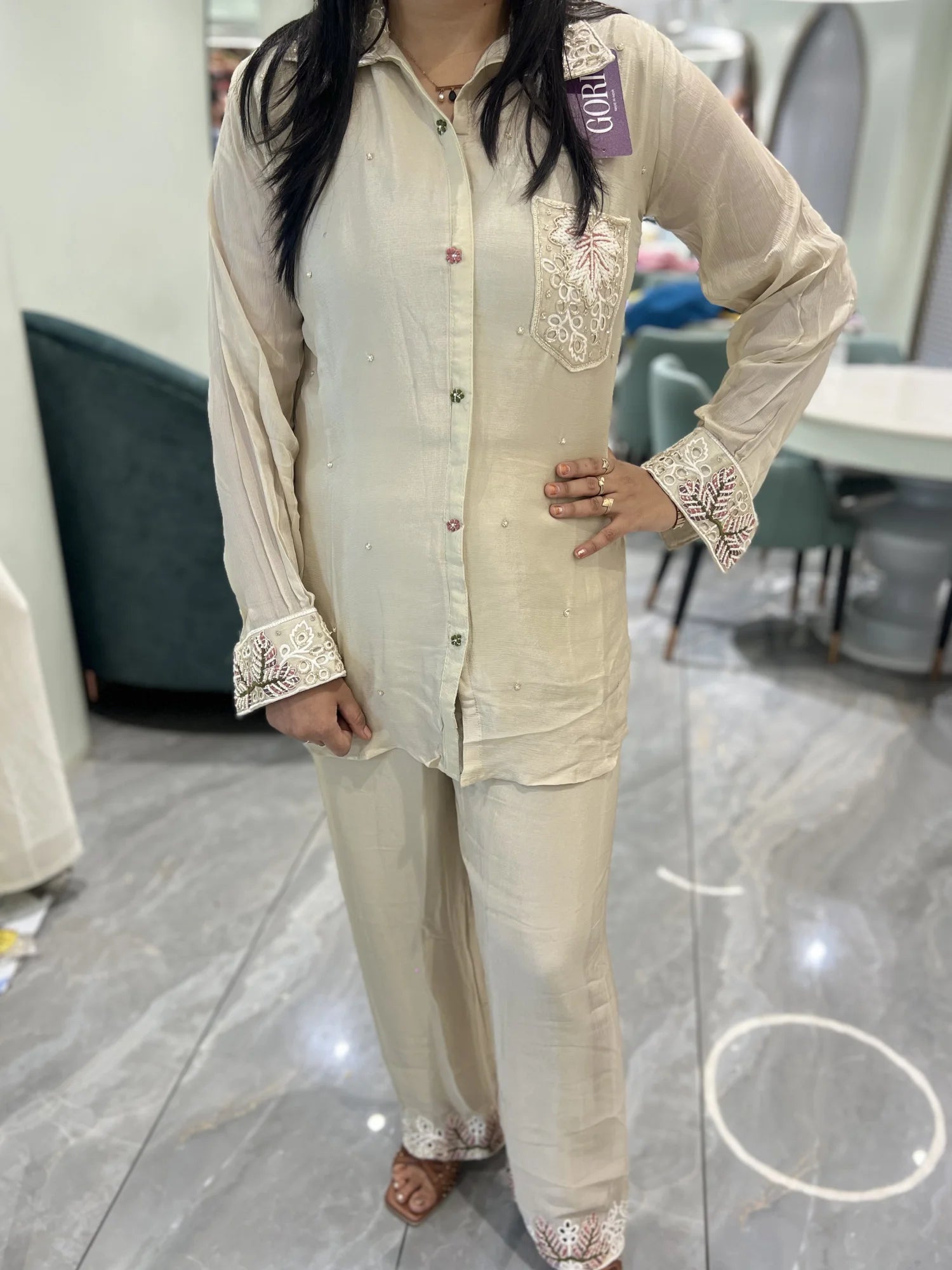 This cream chinon cordset is crafted with fine embroidery detailing. It is designed to bring out elegance and grace, making it perfect for weddings, receptions, parties, and festive occasions. Made with high-quality chinon fabric, this attire ensures comfort while maintaining a premium look. The intricate embroidery work enhances its appeal, giving it a sophisticated finish. Ideal for those who appreciate traditional craftsmanship with a modern touch.