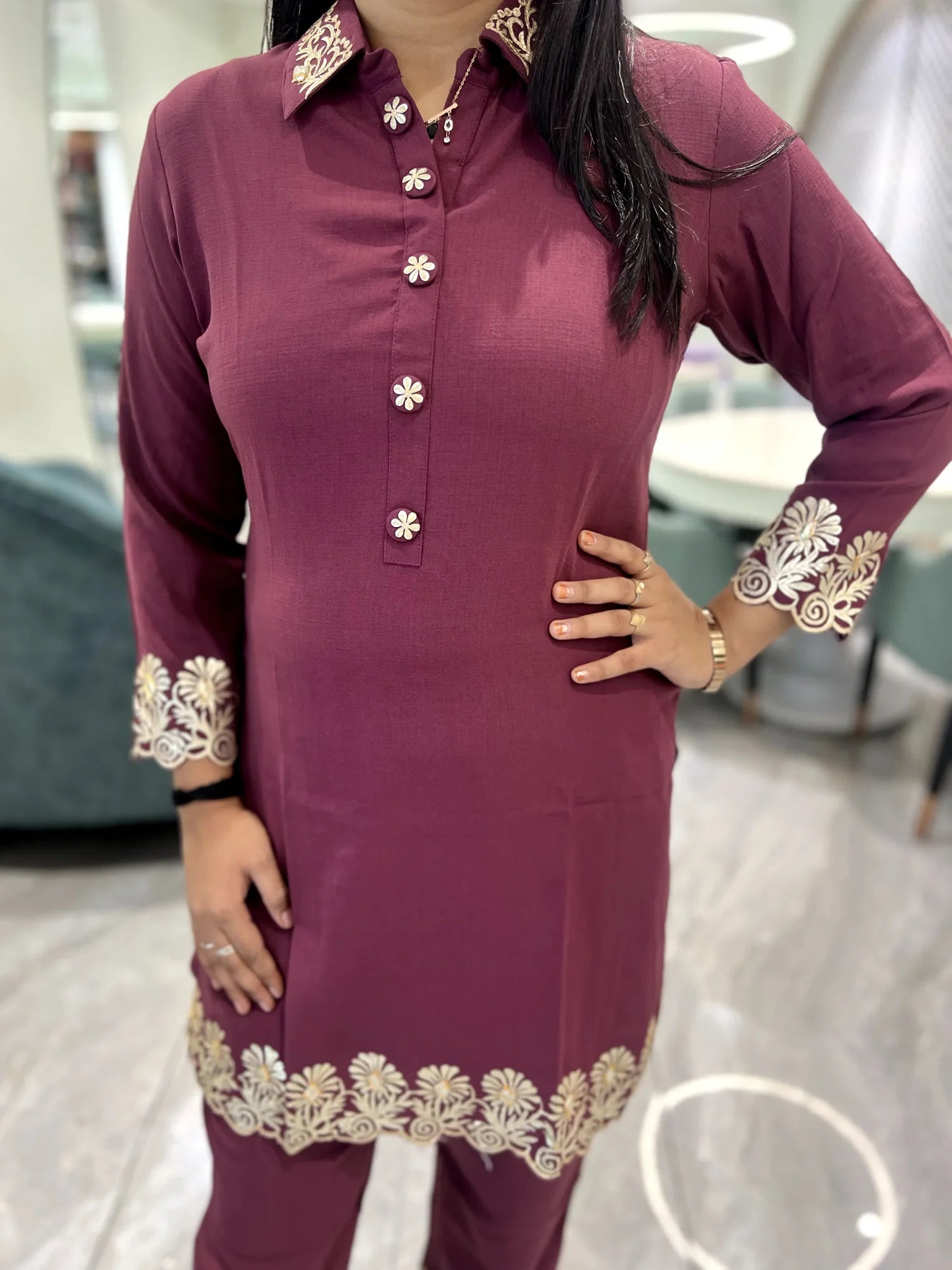 This maroon khadi cotton cordset is crafted with fine gota work detailing. It is designed to bring out elegance and grace, making it perfect for weddings, receptions, parties, and festive occasions. Made with high-quality khadi cotton fabric, this attire ensures comfort while maintaining a premium look. The intricate gota work work enhances its appeal, giving it a sophisticated finish. Ideal for those who appreciate traditional craftsmanship with a modern touch.