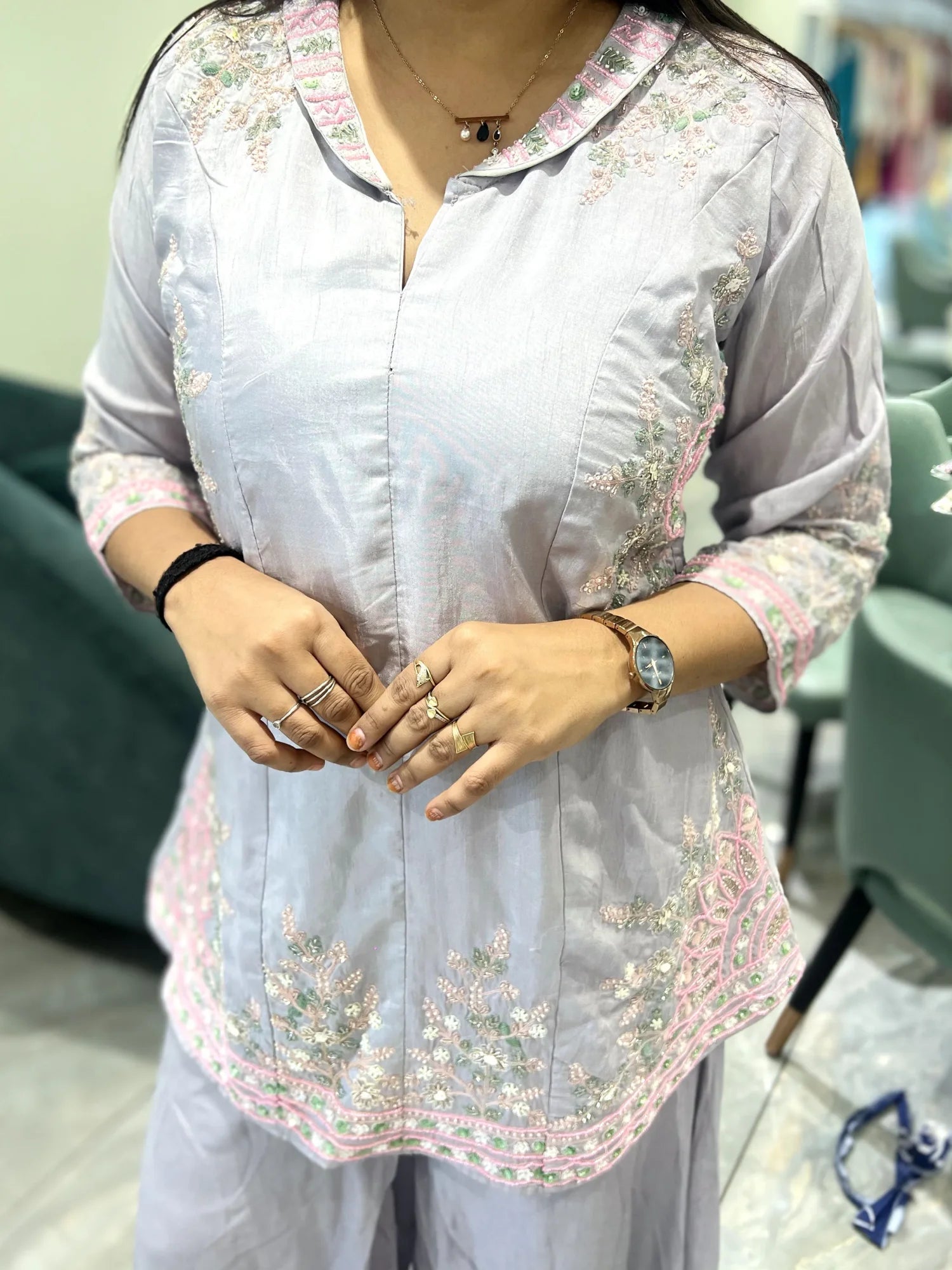 This silver chinon indo western is crafted with fine embroidery detailing. It is designed to bring out elegance and grace, making it perfect for weddings, receptions, parties, and festive occasions. Made with high-quality chinon fabric, this attire ensures comfort while maintaining a premium look. The intricate embroidery work enhances its appeal, giving it a sophisticated finish. Ideal for those who appreciate traditional craftsmanship with a modern touch.