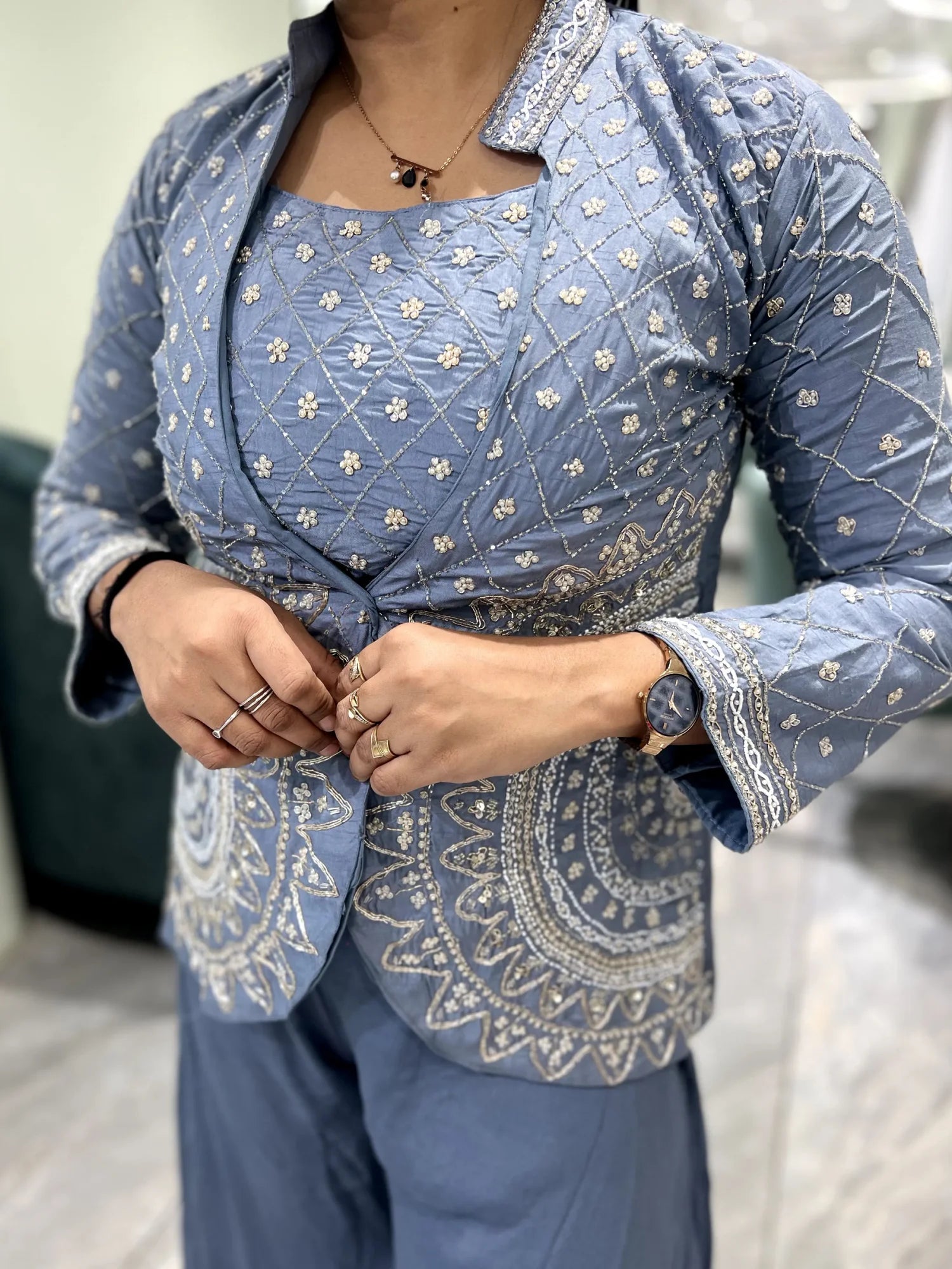 This sky blue chiffon indo western is crafted with fine hand work detailing. It is designed to bring out elegance and grace, making it perfect for weddings, receptions, parties, and festive occasions. Made with high-quality chiffon fabric, this attire ensures comfort while maintaining a premium look. The intricate hand work work enhances its appeal, giving it a sophisticated finish. Ideal for those who appreciate traditional craftsmanship with a modern touch.